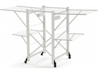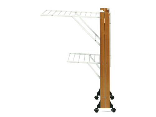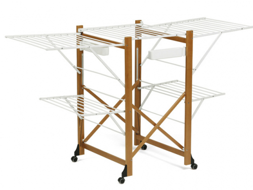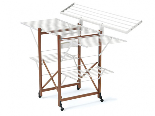 Каркас изделия изготовлен из высокопрочной древесины бука, а перекладины - из лёгкого алюминия. Помимо нескольких ярусов решёток для сушки белья, она снабжена небольшими ящиками для мелочей. Встроенные колёсики делают её очень мобильной, а складная конструкция позволяет сэкономить место в вашем доме. Особенно удобно то, что её не надо раскладывать полностью, если вам не нужна вся её поверхность.