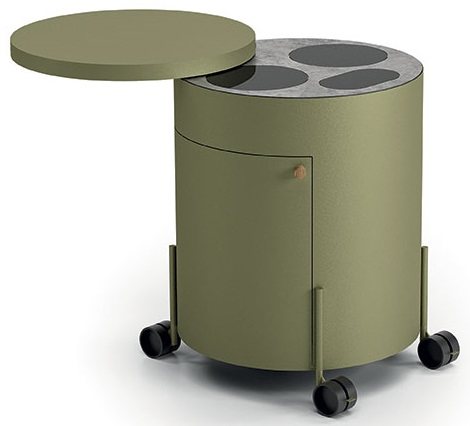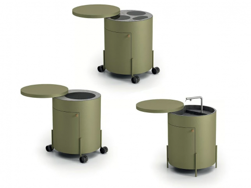 Модуль Phil состоит из цельного цилиндрического металлического основания. С изысканными деталями из тикового дерева он поставляется в трех возможных конфигурациях: с раковиной, индукционной панелью и барбекю. Эти «круглые острова» могут сосуществовать со своими различными функциями, создавая круговое движение и деятельность, или использоваться самостоятельно.