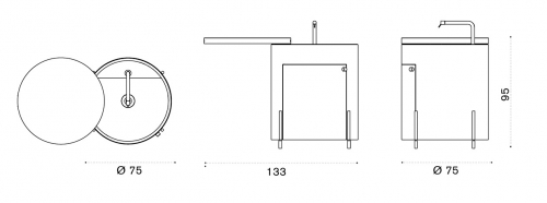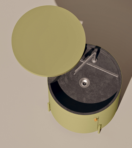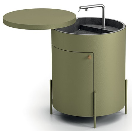 Модуль Phil состоит из цельного цилиндрического металлического основания. С изысканными деталями из тикового дерева он поставляется в трех возможных конфигурациях: с раковиной, индукционной панелью и барбекю. Эти «круглые острова» могут сосуществовать со своими различными функциями, создавая круговое движение и деятельность, или использоваться самостоятельно.