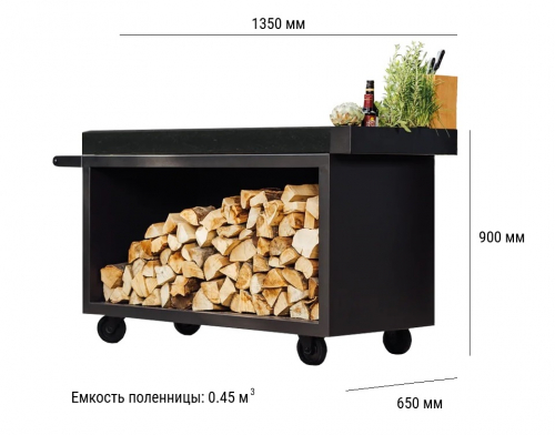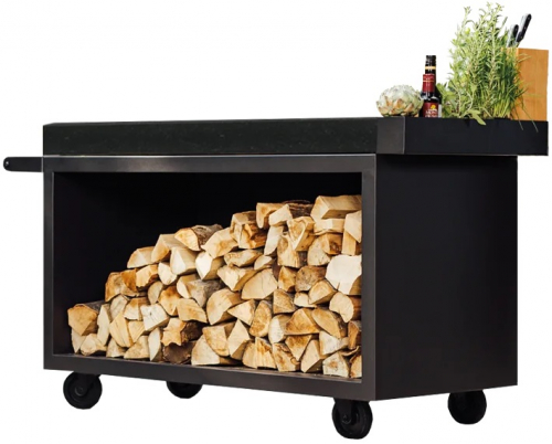 OFYR 135 в черном цвете включает в себя глубокую поленницу для хранения дров, разделочный стол из прочной темной керамики и удобный лоток для специй или аксессуаров.