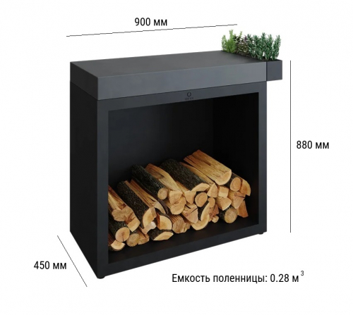 OFYR 90 в черном цвете включает в себя глубокую поленницу для хранения дров, разделочный стол из прочной темной керамики и удобный лоток для специй или аксессуаров.