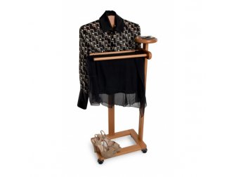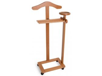 Она имеет всё необходимое: плечики для пиджаков и рубашек, перекладину для брюк и полочку для мелочей и аксессуаров. Встроенные колёсики с функцией анти-след позволяют легко перемещать изделие, при этом не повреждая покрытие пола. Каркас вешалки изготовлен из высококачественного массива бука, который отличается высокой прочностью и долговечностью.