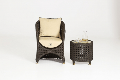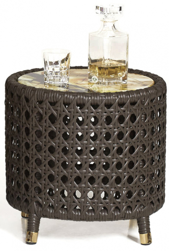Элегантный кофейный столик Wezen с алюминиевым каркасом, оплетенным вручную искусственным ротангом, имеет характерный узор венской соломы. Столик имеет стильную столешницу, выполненную в различных вариантах отделки от стекла, керамики до мрамора. Модель отличается наличием хромированных или позолоченных деталей в виде ножек. Посмотреть палитру материалов Samuele Mazza.