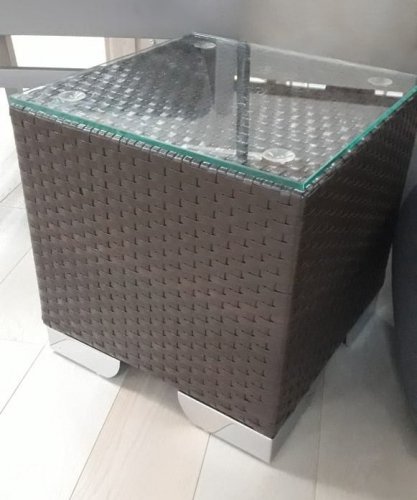 Небольшой столик из искусственного ротанга идеально сочетается с различными видами лежаков.