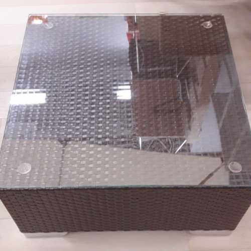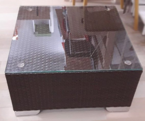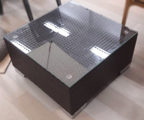Столик из искусственного ротанга в виде пуфа станет отличным выбором для экономии пространства в малогабаритной квартире.