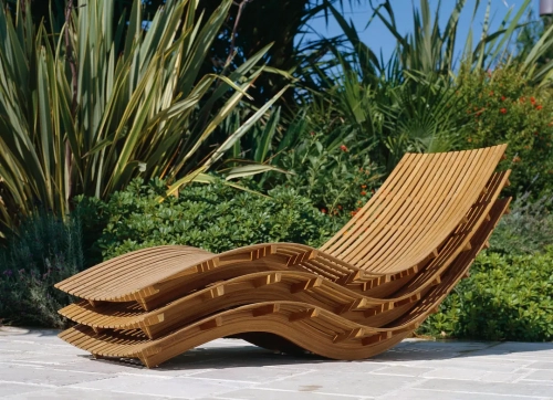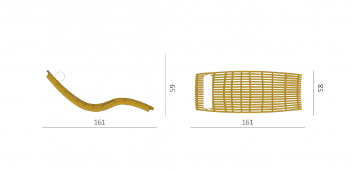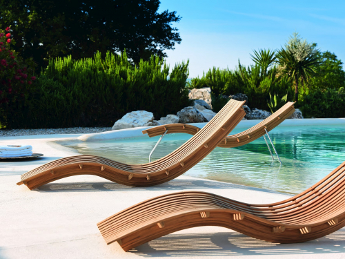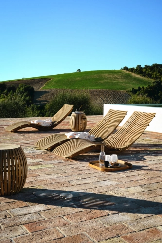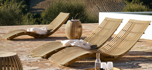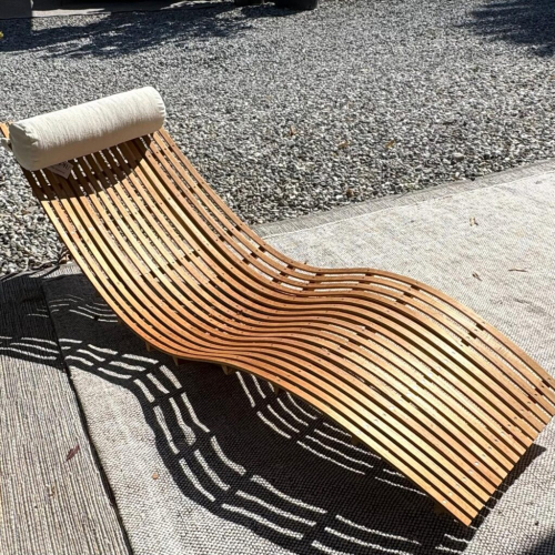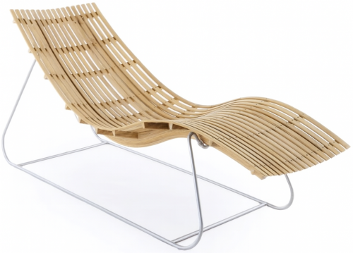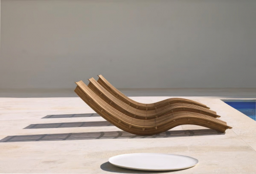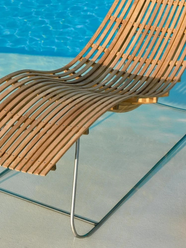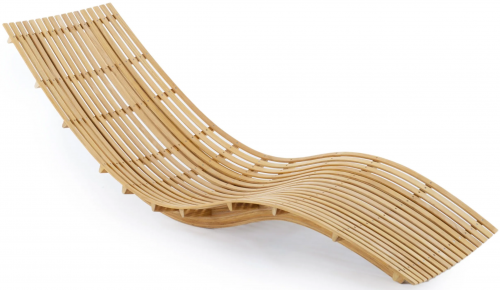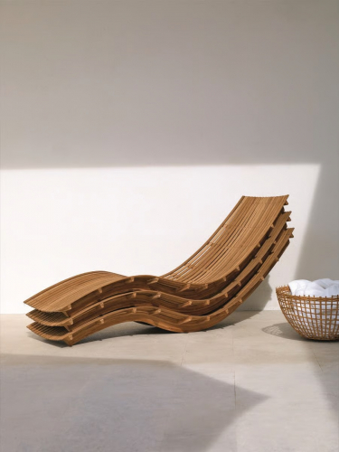 Изогнутые под действием тепла планки придают изделиям коллекции Swing извилистый вид и особую эргономичность, таким как лежак и практичные многофункциональные столики-табуреты.
