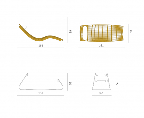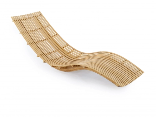 Изогнутые под действием тепла планки придают изделиям коллекции Swing извилистый вид и особую эргономичность, таким как лежак и практичные многофункциональные столики-табуреты.