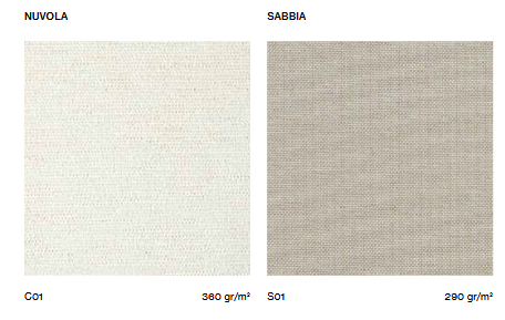 Съемные чехлы подушек выполнены из тканей Unopiu Color Collection, окрашенных с использованием новейших технологий производства, предназначенных для использования на открытом воздухе. Они долговечны, устойчивы к пятнам, плесени, дышат и особенно устойчивы к ультрафиолетовым лучам. Все они обладают такой же мягкостью на ощупь, как и натуральные волокна.