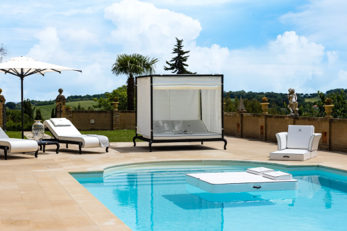 Изделия коллекции Canopo часто используется в сочетании с шатрами коллекции Sole для создания уютных лаунж беседок на открытых пространствах.