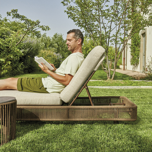 Элегантный и сдержанный дизайн шезлонга Tibidabo разработан так, чтобы гармонировать с различными типами окружающей среды, от домашнего сада до террасы отеля. Несколько простых элементов для создания комфорта на свежем воздухе: от большого и удобного матраса до регулируемой спинки и колес. Лежак украшен переплетением синтетической веревки, подчеркивающей профиль окрашенной алюминиевой конструкции.