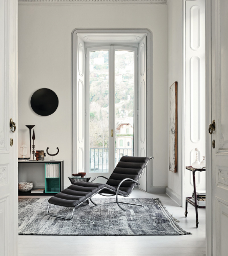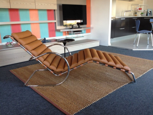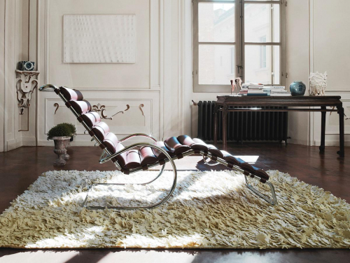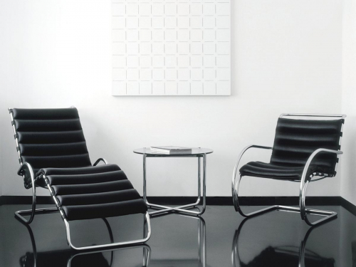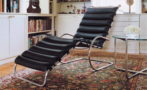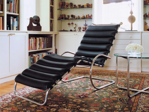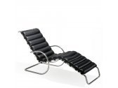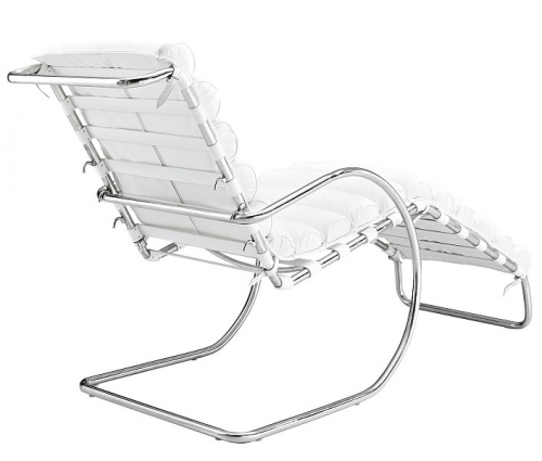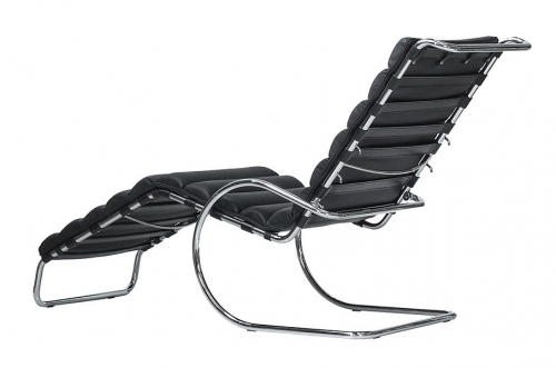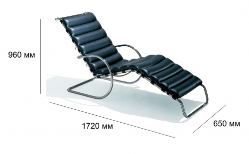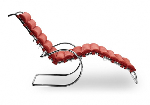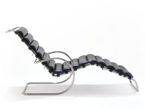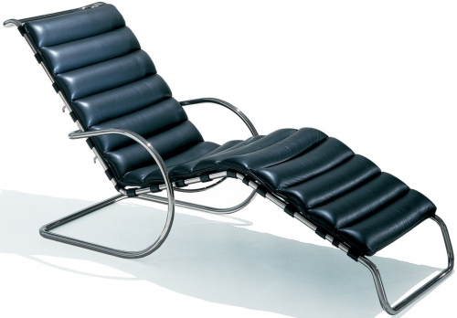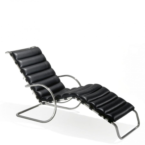 Шезлонг MR был разработан дизайнером Людвигом Мис ван дер Роэ для выставки в Германии. MR представляет собой расслабляющий шезлонг с регулируемым наклоном. Это один из первых образцов стальной мебели Миса ван дер Роэ. Выбор материала был вдохновлен другим мастером Баухауса Марселем Брёйером, а формы считаются современными производными железных кресел-качалок 19 века. Модель имеет консольную конструкцию с применением гнутых стальных элементов и воплощает в себе еще одну захватывающую классику дизайна великого гения. Сочетание гнутой трубчатой стали и обивки из высококачественной кожи придает шезлонгу классический элегантный характер.