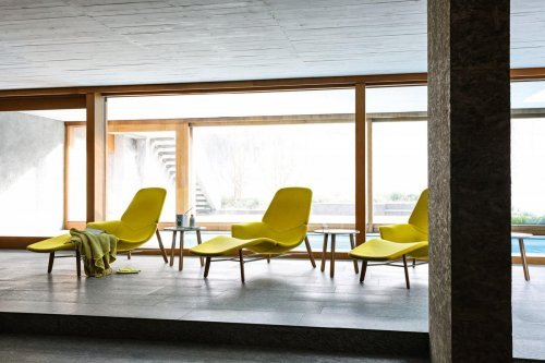 С чертежной доски французского дизайнера Патрика Норге шезлонг Atoll отражает удовольствие от отдыха с извилистыми изгибами, сочетающими эстетическое видение и эргономику. Неземная элегантность удлиненного сиденья переходит от высокой спинки к единственному подлокотнику. Четко очерченные пропорции корпуса контрастируют с гладкой простотой деревянных ножек и металлической конструкции. Шезлонг идеально подходит для обустройства зон отдыха в аэропортах, отелях и спа-салонах, а также является долгожданным убежищем в частных пространствах. В домашних условиях он придает уютную, но в то же время очень современную изысканность; приглашение насладиться драгоценными ритмами медленного времени.