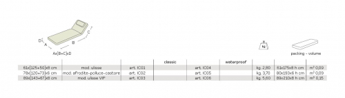 Icaro – это изысканный матрас, созданный для обеспечения дополнительного комфорта лежакам Ulisse. Матрас доступен в трех разных размерах, благодаря чему его также можно использовать в любом другом месте. Оснащенный подголовником, он способен придать большую элегантность и эксклюзивность всему пространству. Изготовленный вручную, Icaro может быть заказан в "классической" или "водонепроницаемой" версии.