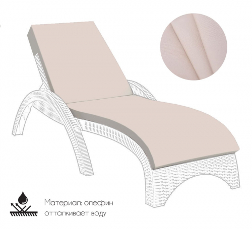 Матрас выполнен из материала олефин с мембраной - 100% полиуретан. Ткань для улицы обладает высокой износостойкостью, не боится дождя, солнца и солёных морских брызг и обладает особой прочностью. Применяемая пропитка придает ткани водоотталкивающие свойства и устойчивость к загрязнениям.