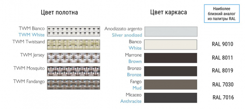 Варианты отделки каркаса: серебристый анодированный алюминий, порошковое покрытие - WHITE, BRONZE, BROWN, MUD, ANTRACITE.
