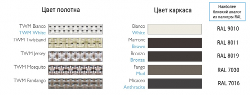 Варианты отделки каркаса: порошковое покрытие - WHITE, BRONZE, BROWN, MUD, ANTRACITE.