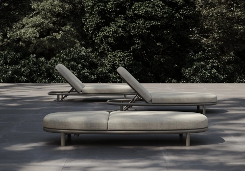 Коллекция включает в себя кресло, двухместный и трехместный диваны, журнальный столик, шезлонг и кушетку, образуя полноценный комплект мебели для отдыха на открытом воздухе, выдержанный в едином стиле. Обеденный гарнитур продолжает эту концепцию благодаря тому же структурированному алюминиевому каркасу, обеспечивая визуальную гармонию всех типов мебели.