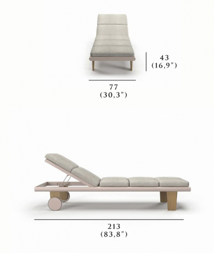 Коллекция Sestri вдохновлена техническим миром судостроения: каждое решение направлено на максимальную функциональность и упрощённую эстетику. Шезлонг-лежак Sestri сочетает продуманную функциональность и сдержанный дизайн: алюминиевый каркас с порошковым покрытием обеспечивает коррозионную стойкость, а теплая фактура ножек из тика уравновешивает техническую ясность алюминиевой рамы, создавая гармоничный образ. Спинка регулируется в несколько положений, что позволяет быстро переключаться между загаром, чтением и отдыхом.