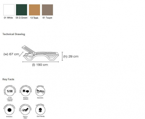 Не боится осадков, моется без усилий. Шезлонг имеет 5 позиций для комфортного отдыха, а также скрытые колеса для легкого перемещения, штабелируется. Устойчив к ультрафиолетовому излучению, имеет антистатическую защиту.