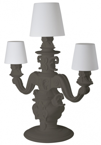 Торжественный светильник King Of Love - величественный, освещающий любую другую мебель, присутствующую в пространстве. Созданный дизайнерами Moro и Pigatti светильник имеет основание в стиле барокко, а три больших ярких белых абажура, украшенных текстурой классических мотивов, благодаря чему получается изысканный, элегантный и приятный на ощупь декор. Этот торшер с впечатляющими размерами характеризуется ироническим и поп-стилем, как и вся коллекция Design of Love.