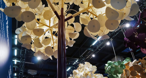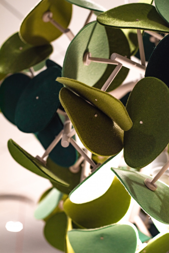 Ствол дерева изготовлен из стальной трубы с порошковым покрытием (любого цвета по шкале RAL). Leaf Lamp Metal Tree - мягкий и естественный светильник, создающий визуальную и акустическую атмосферу. Это светильник размером с дерево для общественных помещений. Ветви образуют великолепную крону листвы диаметром 2300 мм. Светильник опирается на надежную базу, которая может быть привинчена к полу либо дополнена металлической плитой. Leaf Lamp Metal Tree M имеет звукопоглощающие свойства класса A - листва образует мягкий лабиринт из 14 м² шерстяного войлока. Он мягко рассеивает свет, создавая успокаивающую атмосферу, и радикально улучшает восприятие речи в непосредственной близости.