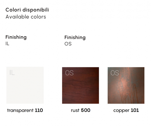 Варианты цвета: отделка с оксидированным эффектом (OS): ржавчина (500), медный (101); с подсветкой (IL): белый прозрачный (110).