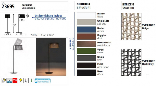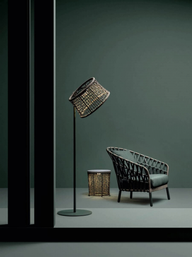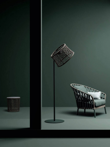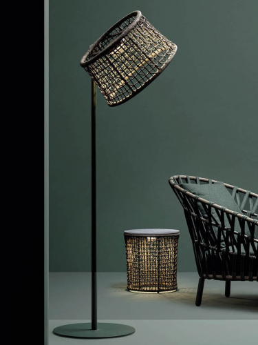 Плетение ручной работы на алюминиевом каркасе с порошковым покрытием превращается в светильник, готовый изменить стиль наружного освещения. Наклоняясь на 360°, он поддерживается алюминиевой опорой с круглым основанием из стали, обработанной по циклу C5M. В комплект входит светодиодный источник света "наружное освещение".