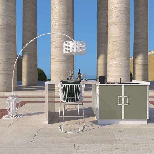 Дуговой торшер Wezen - это идеальный аксессуар для изысканного освещения открытых пространств. Основание из железа окрашено и обработано для использования на открытом воздухе с золотыми или хромированными деталями. Абажур изготовлен из синтетического волокна VIRO® ручного плетения. Торшер сертифицирован для наружного применения. Синтетическое волокно VIRO® ручной работы разработано для длительного использования на открытом воздухе и, следовательно, устойчиво к любым атмосферным воздействиям. Обладает устойчивостью к перепадам температур (от -70°C до +80°C), ультрафиолетовым лучам, не теряет цвет, влагостойкостью, устойчивость к соли и хлору, плесени. Это нетоксичный экологичный материал (на 100% перерабатываемый), по ощущению как натуральный материал. Посмотреть палитру материалов Samuele Mazza.