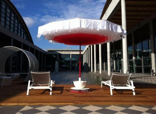 Лепестки из ткани образуют навес, где Вы можете расслабиться и насладиться цветочной феерией. Когда ветерок игриво проходит сковзь зонт, лепестки шуршат и оживают в гипнотическом танце.