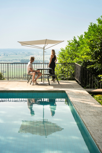 Компактный асимметричный зонт в форме акации подходит для ограниченного пространства балкона или небольшого патио. Его продуманный дизайн позволяет создавать тень большого зонта с гораздо меньшей площадью поверхности. Просто воспользуйтесь ручкой и поверните "крону" к солнцу. Дополнительное освещение под навесом сохраняет дневной свет немного дольше после захода солнца.
