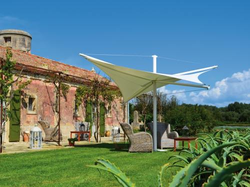 Зонт-парус Vela Dalia характеризуется наличием одной вертикальной опорной балки, к которой прикрепляется оцинкованная стальная структура поддержки тента из ткани ПВХ.