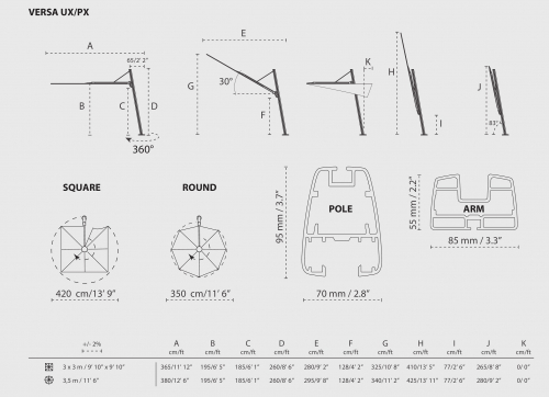 Зонт Versa UX Architecture - самая нейтральная и гладкая модель линейки Versa UX. Зонт создан на основе плавных оттенков серого, характерных для различных брендов уличной мебели. Это самая спокойная модель, но от этого не менее роскошная. Дизайнеры поиграли с квадратными элементами и нашли идеальное сочетание для чистого и современного окружающего пространства. Основное внимание здесь уделяется очищению: возвращению к сути! Очень четкое заявление с минимальным количеством различных элементов и материалов, только чистых материалов. Модный потребитель с чувством деталей и стремлением к совершенству легко интегрирует этот зонт в свой личный мир.