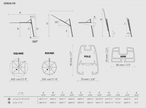 Зонты придают особый вид любому месту на открытом воздухе. Коллекция создана благодаря сотрудничеству нескольких дизайнеров, стилистов и творческих умов. Модели Versa PX вдохновлены чистой и изысканной архитектурой, живостью и непредсказуемостью природы, теплом и мягкостью средиземноморской культуры и освежающим ощущением моря и волн.