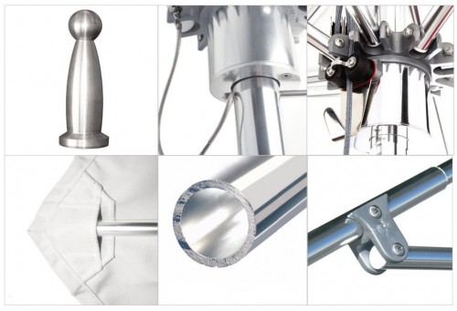 - Для изготовления каркасов зонтов TUUCI используются алюминиевый сплав морского класса, стекловолокно и нержавеющая сталь, чтобы создавать красивые, но чрезвычайно прочные конструкции, которые работают в самых суровых условиях. Варианты отделки: Polished Titanium, Sea Shell White, Textured Bright White, Ash Grey, Hammered Bronze, Espresso, Jet Black, Graphite.