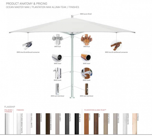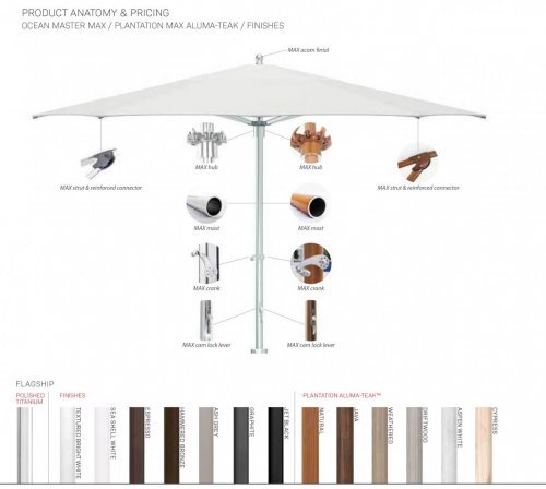 - Для изготовления каркасов зонтов TUUCI используются алюминиевый сплав морского класса, стекловолокно и нержавеющая сталь, чтобы создавать красивые, но чрезвычайно прочные конструкции, которые работают в самых суровых условиях. Варианты отделки: Polished Titanium, Sea Shell White, Textured Bright White, Ash Grey, Hammered Bronze, Espresso, Jet Black, Graphite.