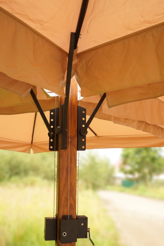 - Зонт поворачивается на 360 градусов вокруг своей оси. Зонт можно закрепить под любым требуемым углом поворота специальными крепежными узлами. Легкость поворота обеспечивается упорным подшипником и специальной смазкой до 300 °C.