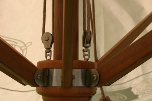 Купол состоит из отдельных элементов, которые привинчены к раме крючками из стали высшей пробы вверху и винтами из нержавеющей стали к концам спиц. Ткань купола сменная, свето- и водостойкая. Она разработана, чтоб выдерживать любые погодные условия.