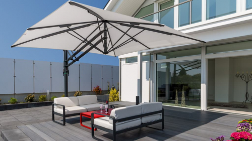 Jumbrella outSide - новое поколение всепогодных зонтов с боковой опорой для профессионального использования в ресторанах, отелях, барах, кафе и частных виллах. Площадь, занимаемая зонтами Jumbrella outSide варьируется от 7 до 16 м². В качестве консольного зонта он достигает своей визуальной легкости за счет боковой стойки. Техническая устойчивая опора, отвечающая за стабилизацию "отходит в сторону" и, следовательно, на задний план, не препятствуя свободному затенению пространства. Дополнительное оборудование поможет сделать функциональный дизайн еще более комфортным и уютным.