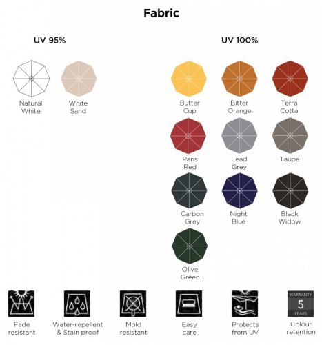 Ткани для зонтов обладают грязеотталкивающими и водоотталкивающими свойствами, а также не выцветают. Кроме того, все ткани, из которых изготовлены куполы зонтов, можно стирать и легко заменять. Акрил, используемый для куполов зонтов Prostor, обладает способностью значительно снижать проникновение ультрафиолетовых лучей и предлагает вам и вашим детям идеальную защиту от вредного воздействия солнечных лучей (100% ультрафиолетовых лучей отфильтровываются). 2 более светлых цвета (белый (Natural White), песочный (White Sand)) фильтруют 95% УФ-лучей.