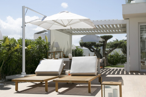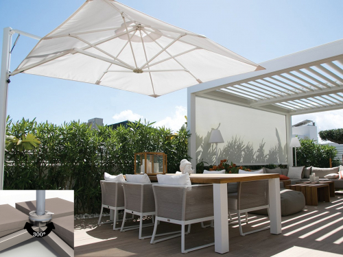 Профессиональный зонт P7 Uno - идеальное решение для затенения открытого пространства, соответствующее вашим потребностям. Стильный дизайн сразу привлекает внимание каждого посетителя, а управление максимально простое, благодаря запатентованной системе "One Move System". Их можно открывать и закрывать одним скользящим движением, что очень удобно. Независимо от того, насколько прочны и надежны зонты, не потребуется много сил, чтобы управлять ими легко и быстро. Также вам не придется беспокоиться о перемещении стульев и столов - зонты открываются и закрываются над мебелью.