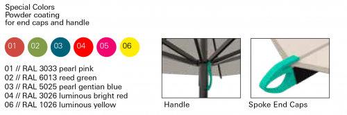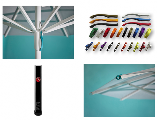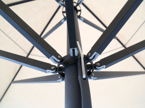 - Открытие и закрытие зонта управляется алюминиевой ручкой с оцинкованной лентой из пружинной стали, которая управляет внутренней телескопической системой.