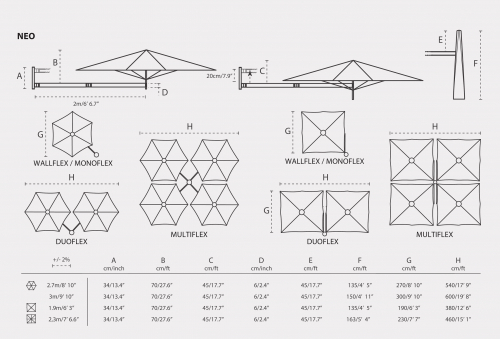 При создании зонтов коллекции Paraflex дизайнеры Umbrosa вдохновлялись манёвренностью и силой человеческой руки, сделав гибкими и мобильными крепления и возможность наклона купола с помощью одной кнопки. Это позволяет создавать тень в нужном месте, в нужное время, в правильном количестве, независимо от положения солнца. Высококачественный каркас выполнен из анодированного алюминия с полиамидными деталями, устойчивыми к ультрафиолету. Купол зонта выполнен из 100% акрила с высокой стойкостью к растяжениям и разрывам, температурным колебаниям (температура использования от -20 до +70°C) и выцветанию. Современный дизайн, надежность и простое использование делают зонт Mono Paraflex незаменимым. Легкая и компактная модель обеспечивает максимальную тень и обладает высокой устойчивостью к ветру (до 49 км/ч).