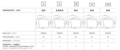 Каркас зонта выполнен из окрашенного алюминия в цвет антрацит, купол может быть выполнен из натурального или окрашенного акрила, Tempotest Para или ПВХ. Благодаря конструкции из алюминия и порошковому покрытию зонт устойчив к коррозии и не боится морской соли. Все ткани имеют высокую стойкость к выцветанию, что обеспечивает долгий срок службы.