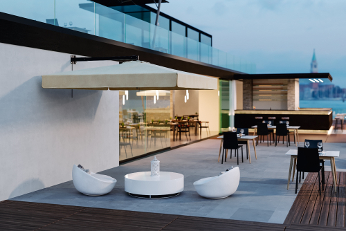 Профессиональный уличный зонт Murales с креплением к стене, который защитит от палящих лучей или летнего дождя и создаст приятную уютную атмосферу на заднем дворе загородного коттеджа, террасе кафе или ресторана, а также любой другой открытой площадке.