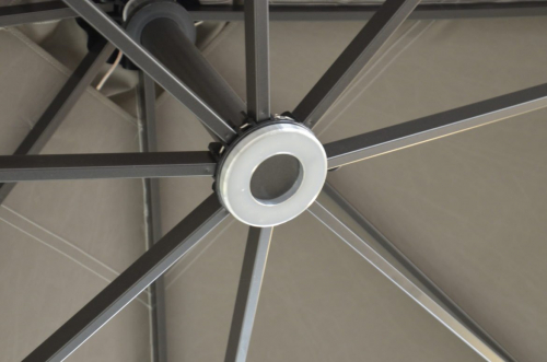 LED Lighting KIT - cистема светодиодного освещения с кабелями, проходящими внутри рамы зонта. Состоит из 4, 6 либо 8 светодиодных панелей из анодированного алюминия. По умолчанию - теплый свет 2700K, по запросу - холодный свет либо комплект RGB-ламп. Степень защиты IP65 - полная защита от проникновения пыли, защита от струй воды со всех направлений.