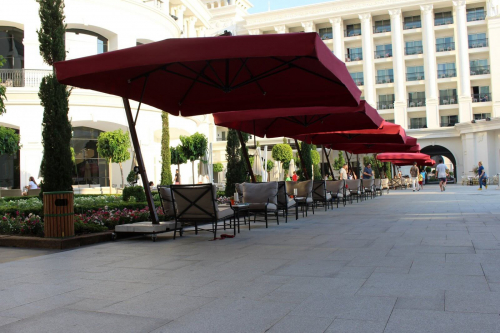 Хотя это корпоративный продукт, предпочитаемый кафе, ресторанами и отелями, однако, зонт Banana также украшает многие сады и террасы. Это очень востребованная модель по таким причинам, как практичность и эргономика, возможность открывать и закрывать, не мешая тем, кто находится под зонтом, а также простота транспортировки и перемещения благодаря утяжелительной базе с колесным тормозом.