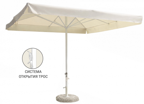 С системой веревочный полиспаст зонт открывается, потянув за веревку на корпусе зонта. После того, как веревка натянута, и купол полностью открыт, зонт фиксируется путем наматывания веревки на крючок на корпусе зонта.