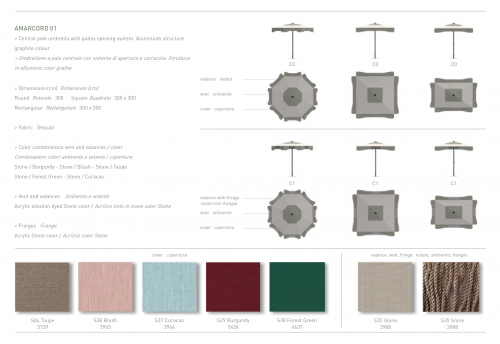 Ключевым элементом коллекции Amarcord является волан, который доступен полностью из тканиили с чередующимися тканевыми элементами и бахромой. Цветовые сочетания купола, декоративного волана и несущей конструкции сочетаются с большим вниманием к деталям и мастерством исполнения, что делает изделие элегантным предметом интерьера.
