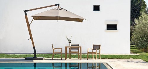 При поддержке стойки из натурального дерева с геометрически симметричными линиями, Holiday - практичный и практичный аксессуар для открытых пространств.