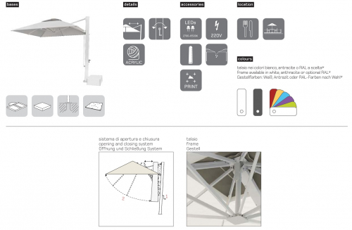 Престижный и элегантный зонт Diomede – это профессиональная модель, отличающаяся большим функционалом и практичностью. Изделие доступно в различных формах и размерах, что является определяющим фактором, позволяющим подобрать наиболее подходящий зонт для любых мест. Он станет отличным выбором в обстановке зон отдыха на пляжах и возле бассейна, а также подойдет для украшения пространств в барах и летних кафе.